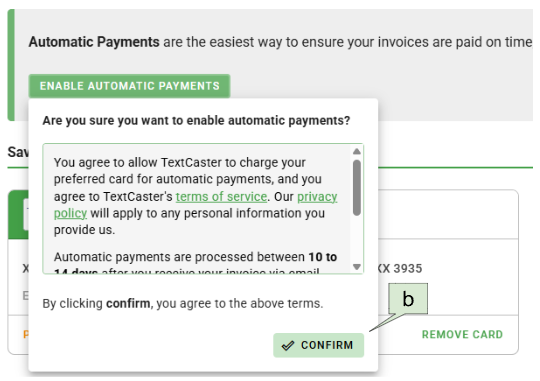 b. Click on “Confirm” to agree to the Automatic Payment terms.