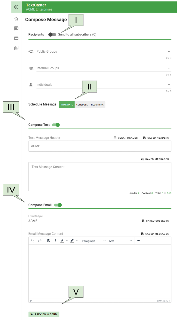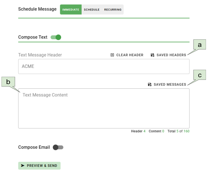 To add a subject to your text message, use the Header field. This field may be pre-populated and non-editable if a required header has already been entered, in which case it will appear grayed out.