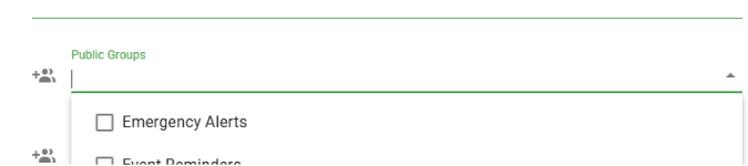 These are the message groups listed on your Sign-up Page. To select a Public Group, click the down arrow on the right of the field and select the desired group(s). Begin typing to filter by name.